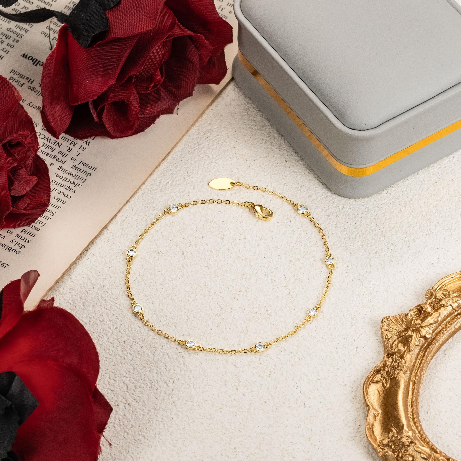 Add effortless shine to your look with this elegant 14K gold, non-tarnish diamond anklet—perfect for daily wear, travel days, photoshoots, and soft-luxury content.